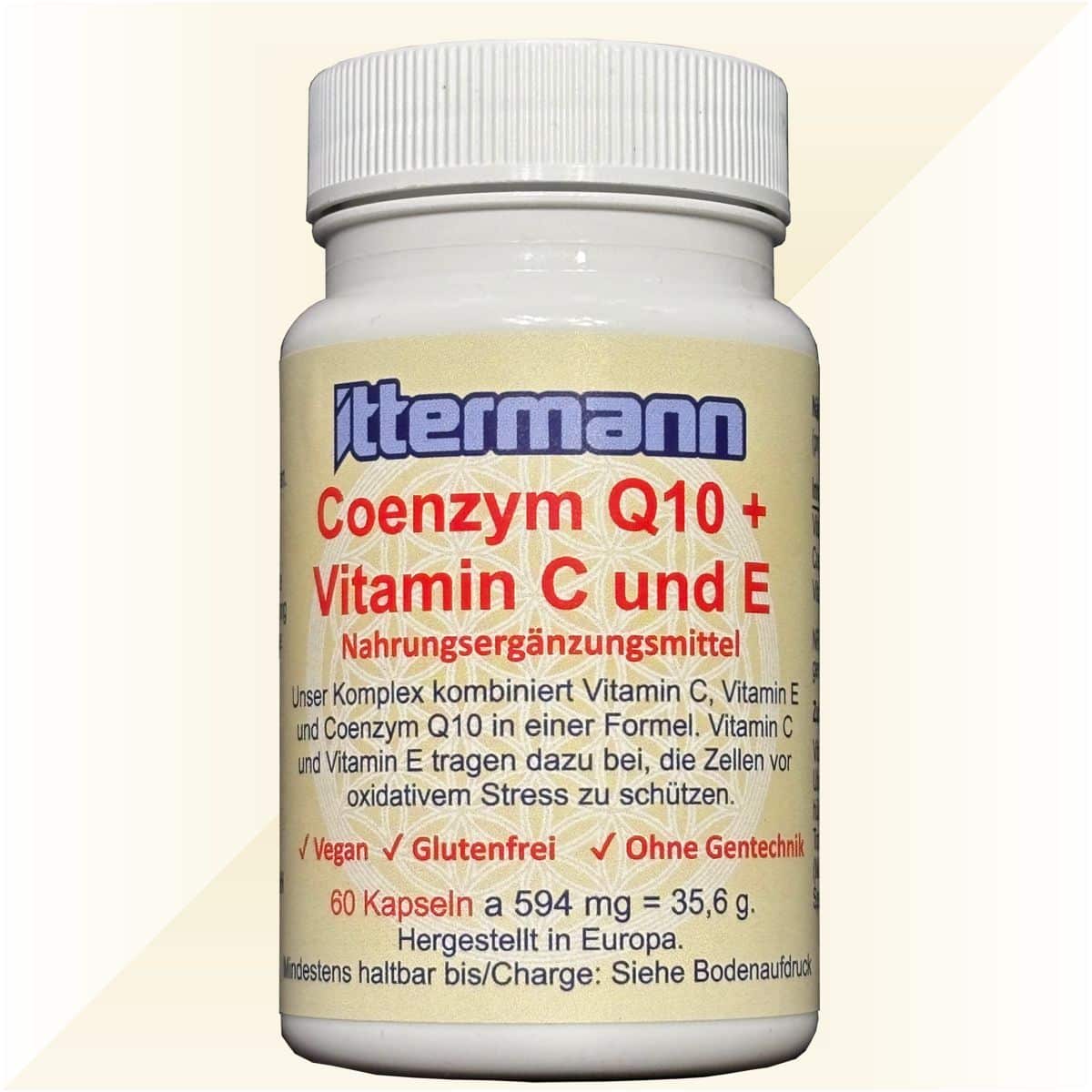 Ittermann Coenzym Q10 + Vitamin C und E ist ein Nahrungsergänzungsmittel, das Coenzym Q10, Vitamin C und Vitamin E in einer Formel kombiniert.