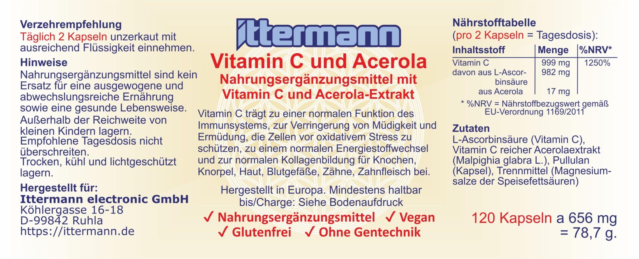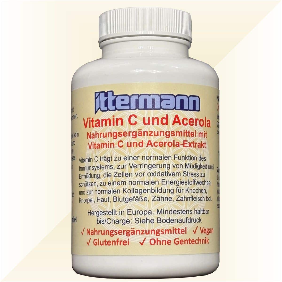 Ittermann Vitamin C und Acerola ist ein Nahrungsergänzungsmittel mit Vitamin C und Acerola-Extrakt.